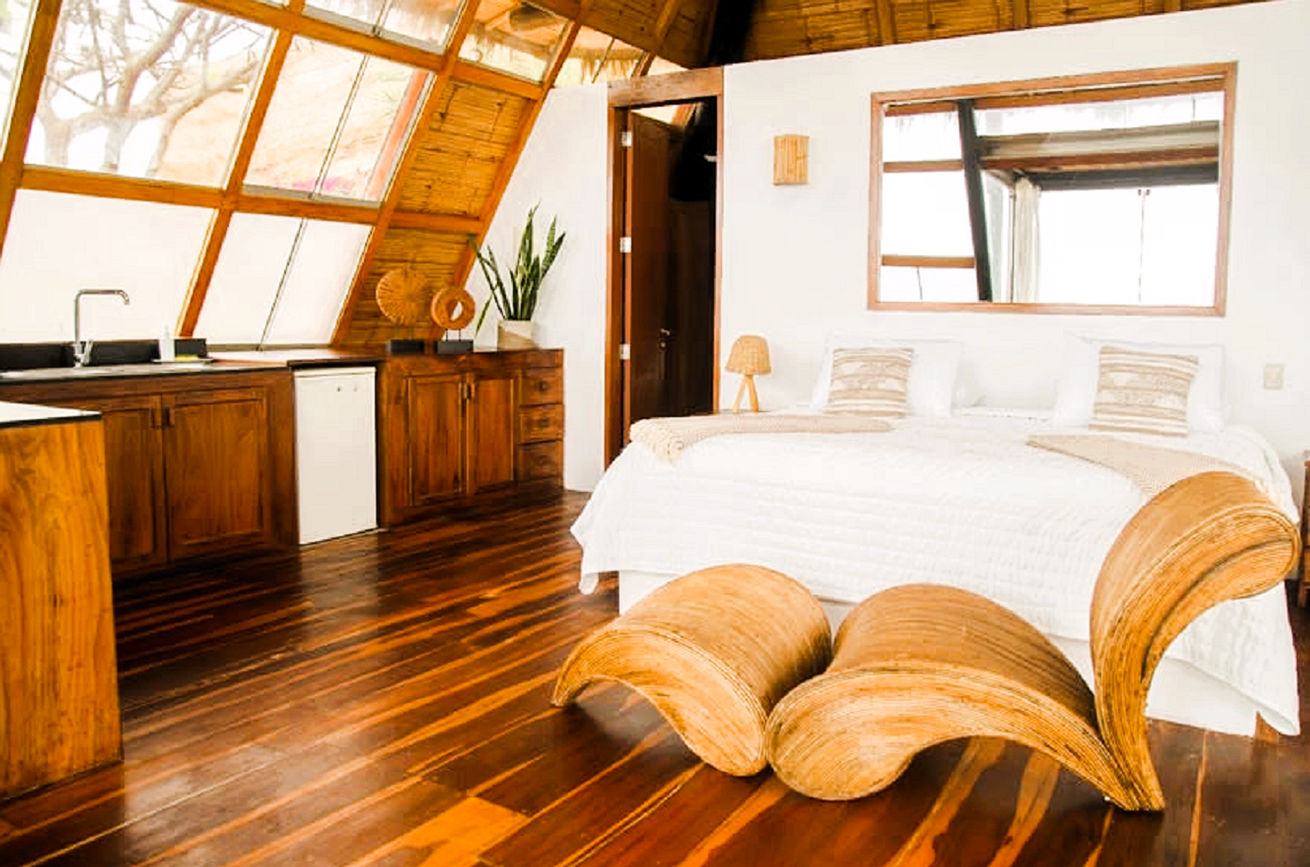 La pirámide Inti es de 1 piso y cuenta con una cama matrimonial tamaño king, un sofá cama, cocina equipada, mesa de comedor, baño privado y terraza privada. Ideal para 3 personas.