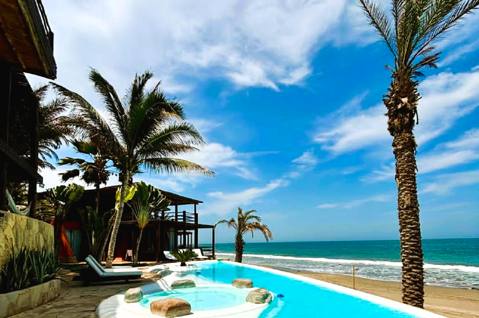Cuenta con 3 casas tipo pirámides en un área de 3000 metros cuadrados frente al mar, playa Las Pocitas en Máncora. Cada pirámide es independiente y está ubicada en diferentes niveles dentro de la propiedad, para brindarle una vista espectacular desde cada casa. Es una propiedad especial por la arquitectura por sus tres pirámides que junto con la naturaleza brindan paz y energía.